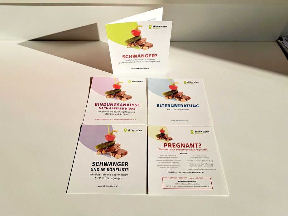 Druckfrisch liegen neue Folder mit Informationen über das Beratungsangebot von aktion leben vor. Es gibt je einen Folder zu den Themen Schwangerenberatung, Beratung im Konflikt, Bindungsanalyse und Elternberatung, die gemeinsam verschickt werden. Außerdem liegt ein mehrsprachiger Folder mit einer Kurzbeschreibung des Beratungsangebots in Englisch, Arabisch, Ukrainisch und Italienisch bei.